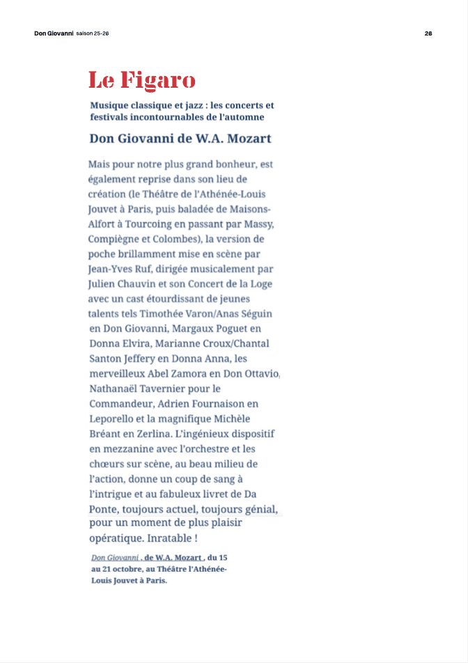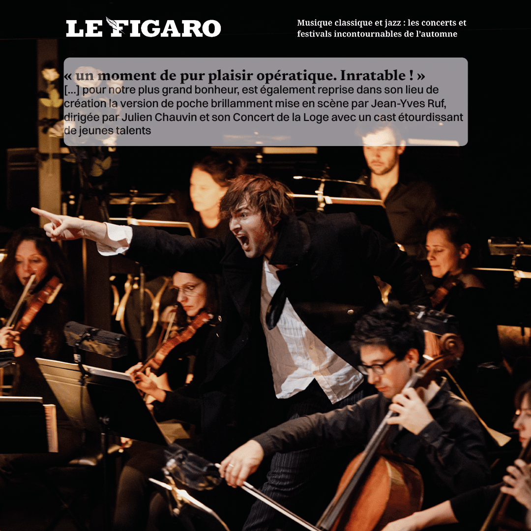 « Mais pour notre plus grand bonheur, est également reprise dans son lieu de création la version de poche brillamment mise en scène par Jean-Yves Ruf, dirigée par Julien Chauvin et son Concert de la Loge avec un cast étourdissant de jeunes talents […]