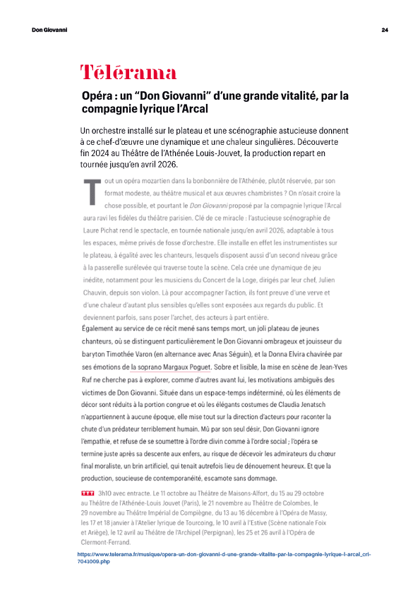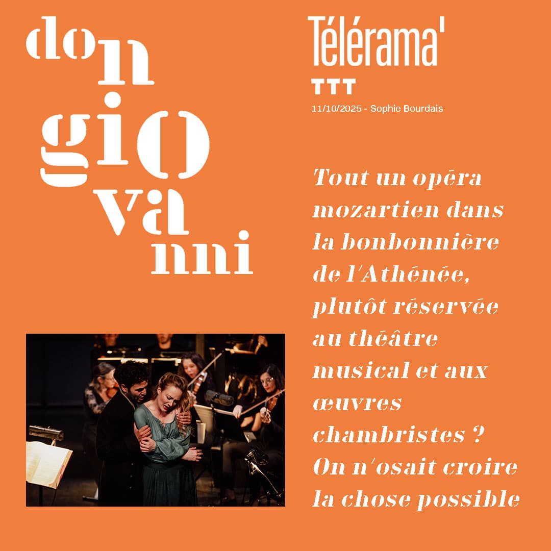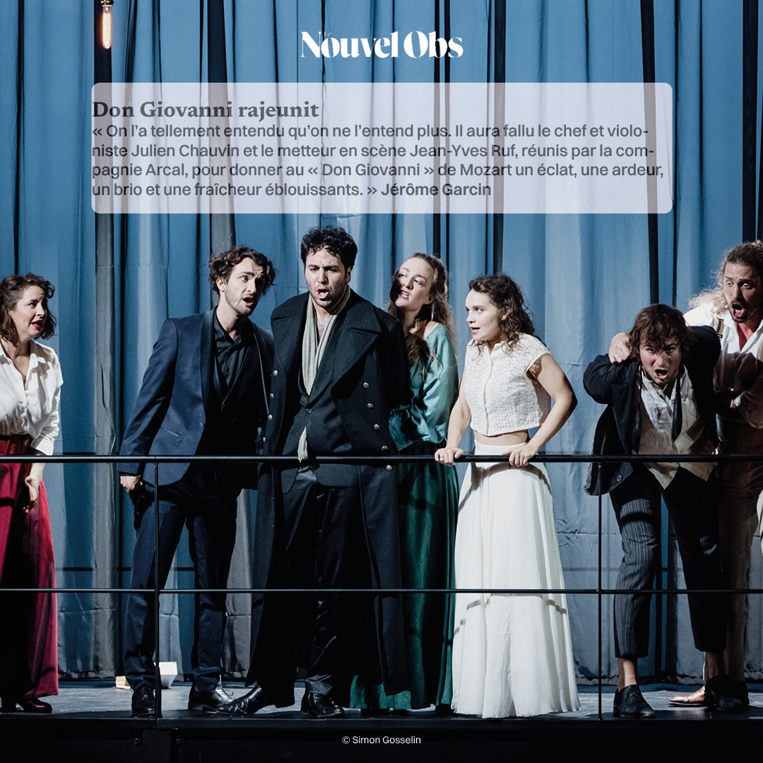 « On l’a tellement entendu qu’on ne l’entend plus. Il aura fallu le chef et violoniste Julien Chauvin et le metteur en scène Jean-Yves Ruf, réunis par la compagnie Arcal, pour donner au « Don Giovanni » de Mozart un éclat, une ardeur, un brio et une fraîcheur éblouissants. »